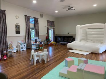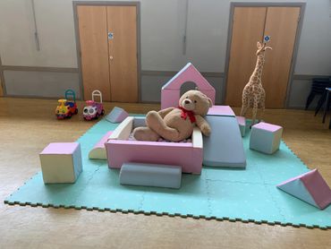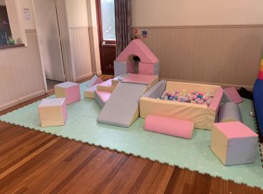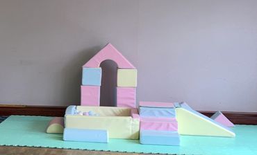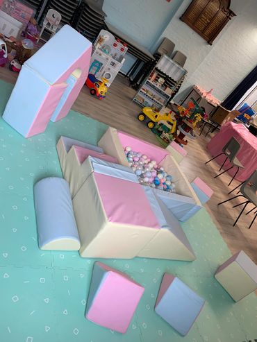 Our pastel softplay set up consists of a large ballpit, step and slide with play blocks, NEW cream tunnel, pop up tent and slide on an extra large pastel green play mat.